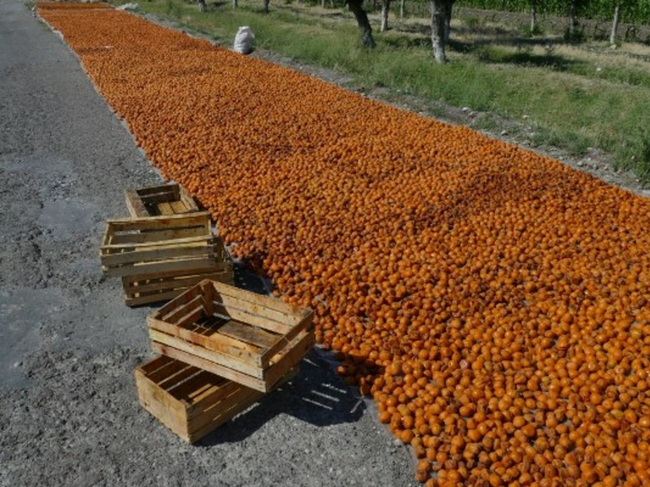 Вот вялятся прямо на обочине дороги абрикосы — часть урожая идёт на курагу. Это уже начало пути по Таджикистану.