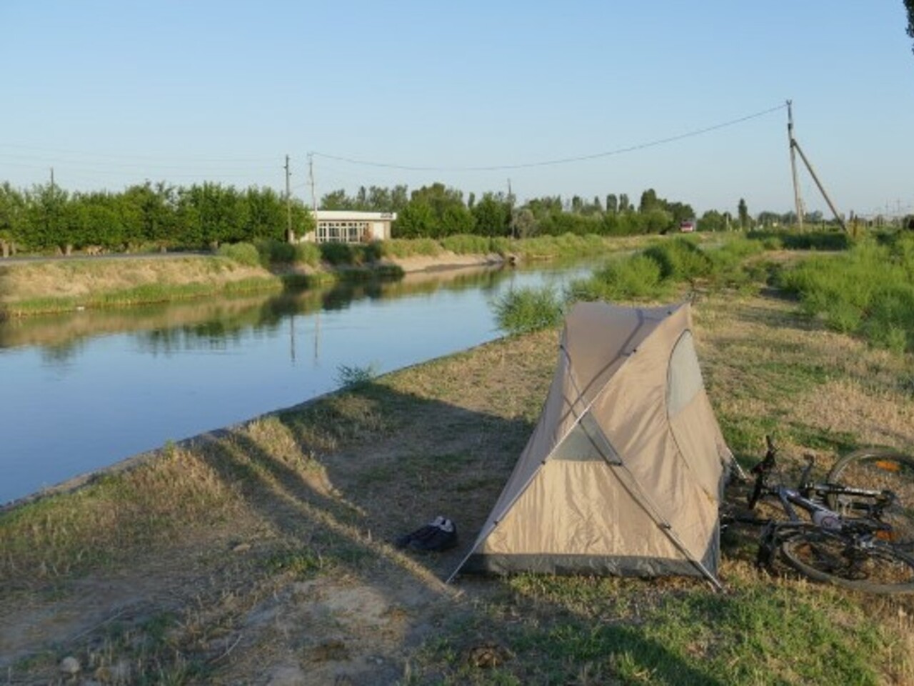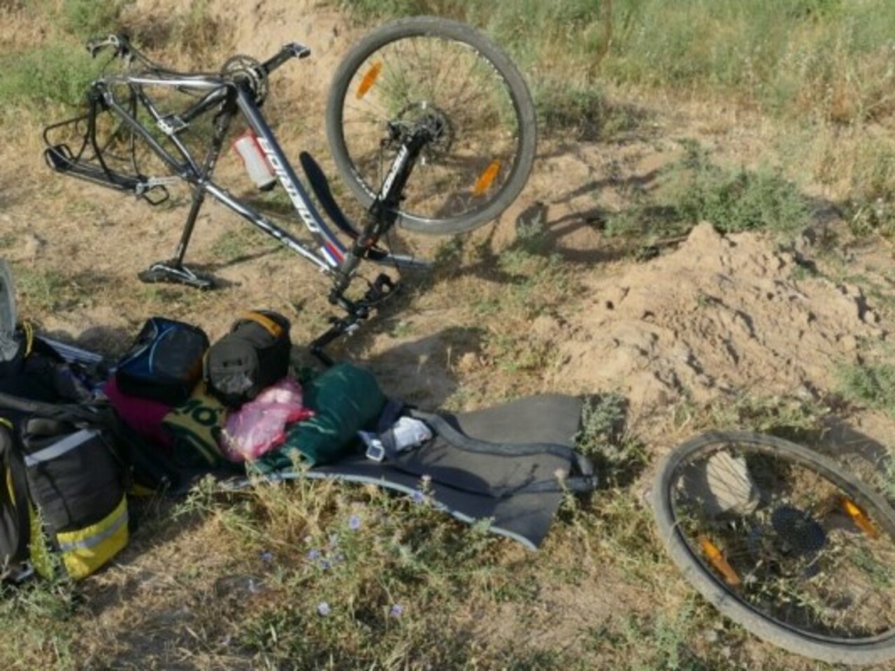 «Из Чимкента выехал в обед, но жара такая, что ехать невозможно. На выезде сворачиваю в частный сектор и становлюсь в тень для отстоя. Тут же меня находят местные и почти силой загоняют во двор. Три часа сидим на топчане под навесом, пьём холодный компот и говорим. Местное гостеприимство не позволяет, чтобы путник просто валялся под кустом, дожидаясь прохлады. От еды кое-как отболтался. Оказалось это турки, переселённые Сталиным в 1944 году из Грузии, из Аспиндзы. А ещё раньше их предки жили на озере Ван. В 17 часов солнце слегка опустилось, и я поехал. Силы после компота прибавились, и я решил под хорошее настроение создать задел на следующий день. Под самый вечер взял первый перевал Кызылгурт. Перевальчик невысокий, так, для тренировки и постепенного втягивания».
