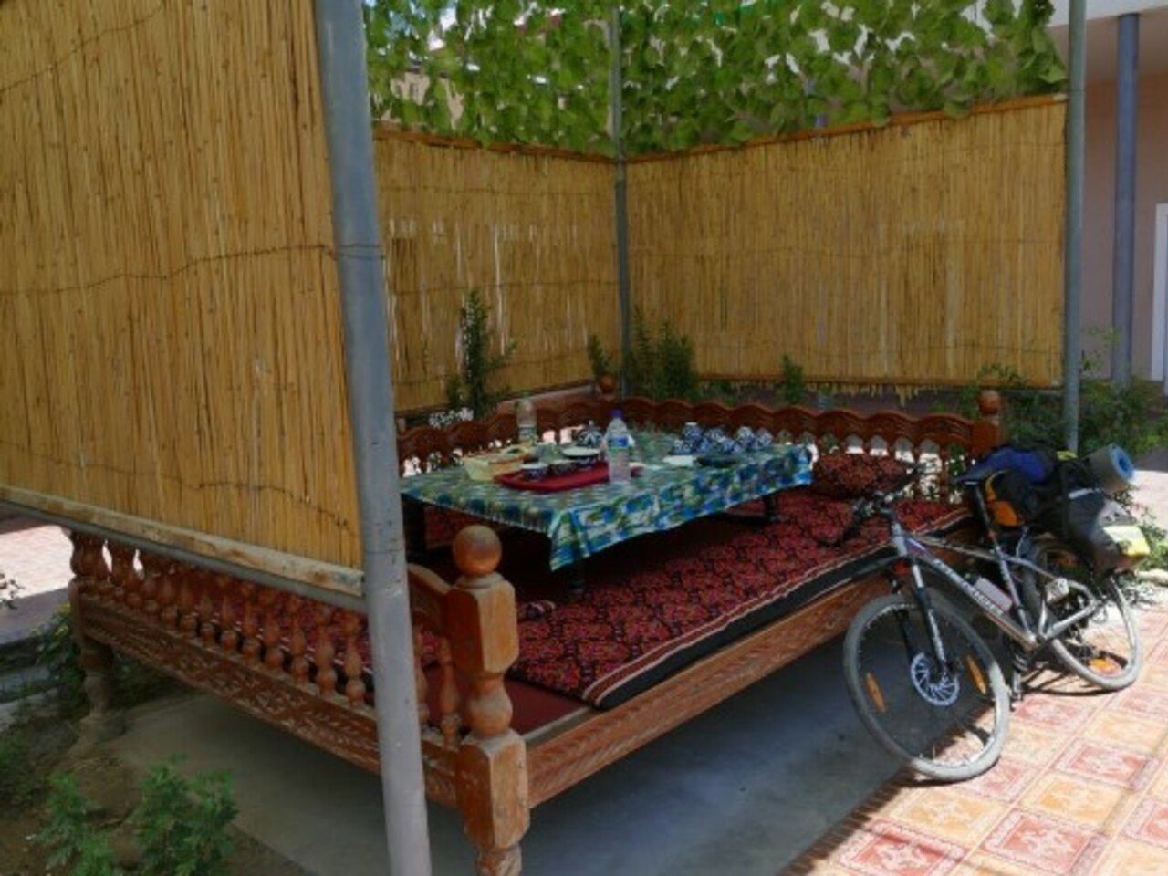 — В Узбекистане поесть вообще не проблема, — говорит Антон. — И всё вкусное, свежее. Цены такие, что на 100 рублей ты ешь, на 150 обжираешься, а на 200 объём пищи невозможно поглотить за один раз. Типичное место для обеда и отдыха — топчан, покрытый ковром, под навесом. Можно и поесть, и поспать после обеда.