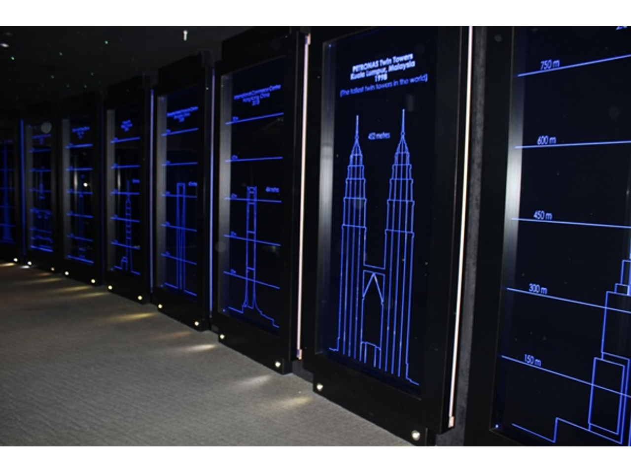 Далее подъем на вторую смотровую — 86 этаж и порядка 360 метров. Здесь тоже потрясающая панорама, а также небольшой музей и светодиодная галерея башен мира — парижская Эйфелева, дубайская Бурдж-Халифа и прочие знаменитые «свечки» с необходимым набором характеристик.