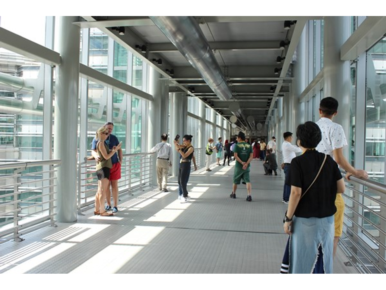 Экскурсия представляет собой подъем на две смотровые площадки — сначала на так называемый «небесный мостик» — переход между двумя башнями. Это 41 этаж и 170 метров высоты, там минут 15-20, чтобы полюбоваться видами и пофотографироваться.