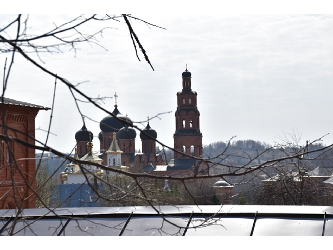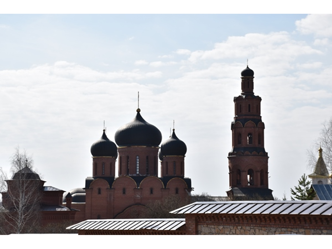 Уже с подъездной дорожки монастырь поражает своей красотой и величеством. Он как замок, со всех сторон обнесенный каменным забором, возвышается на горе. В центре красуется храм с черными куполами, золотыми крестами и высокой колокольней, с которой после утренней службы на всю округу раздается колокольный звон.