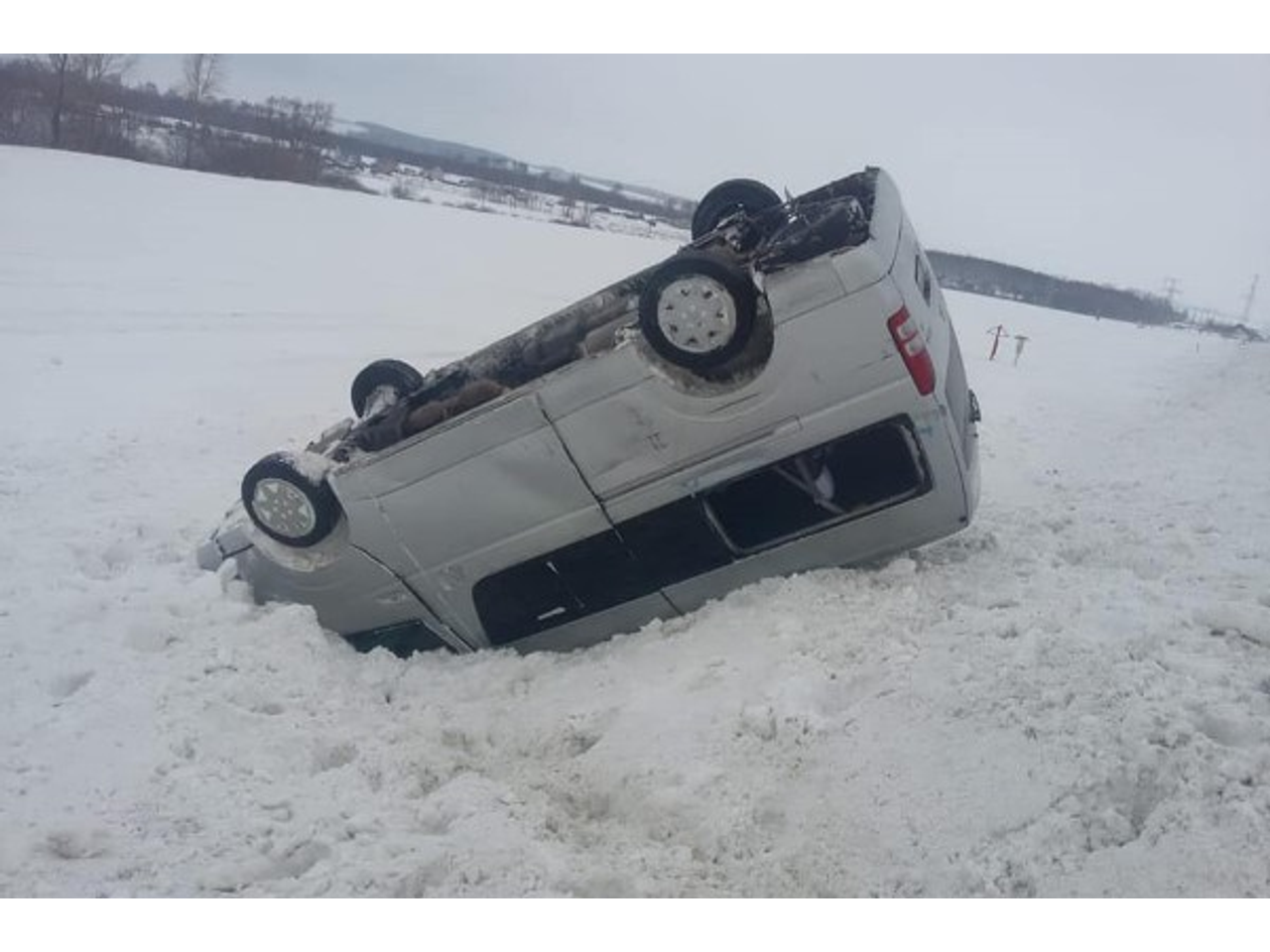 В Башкирии на трассе Уфа-Оренбург произошло опрокидывание микроавтобуса. Трех человек, которые находились в салоне, осматривают медики.