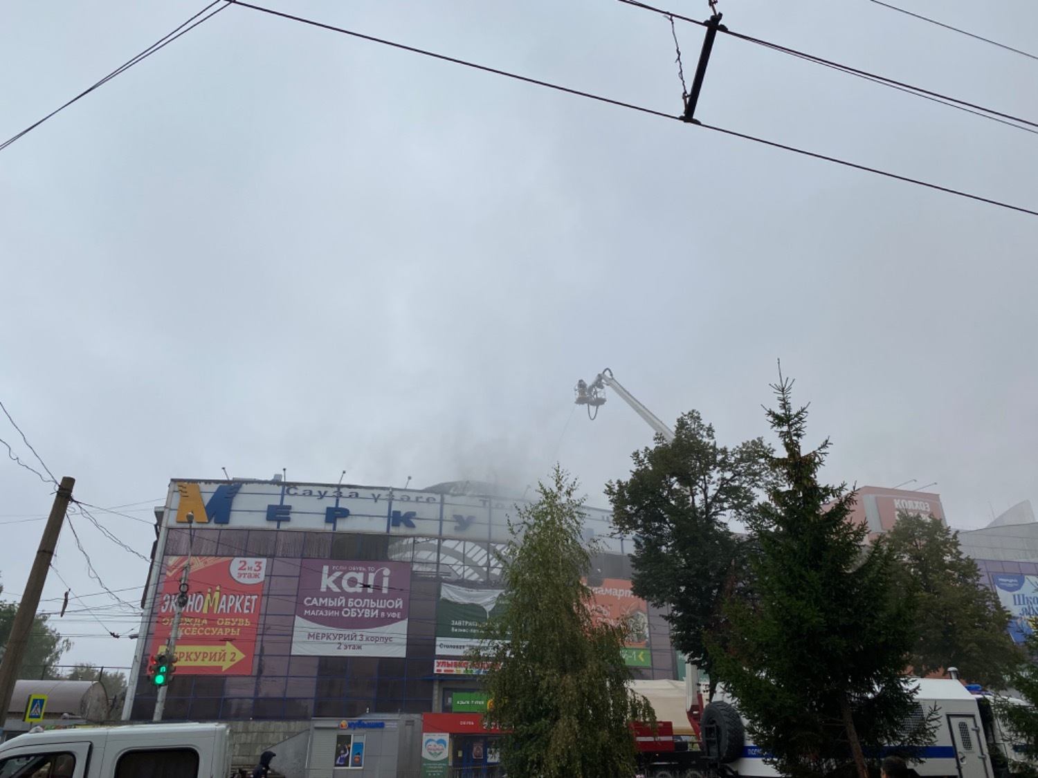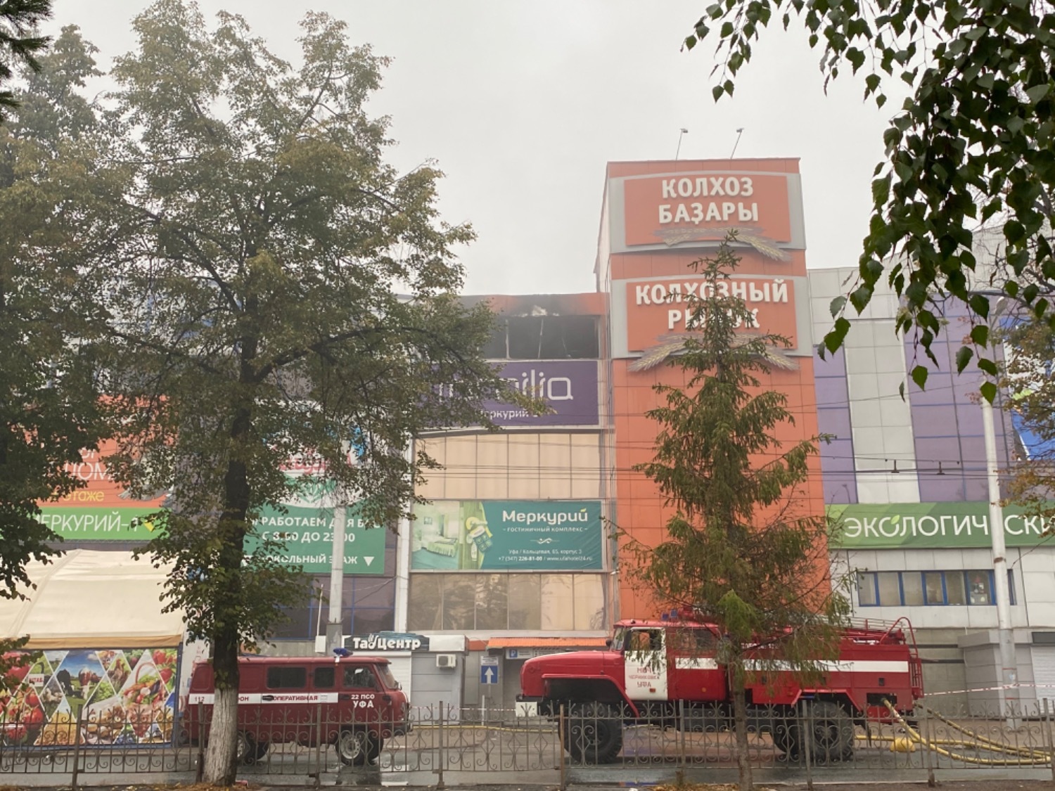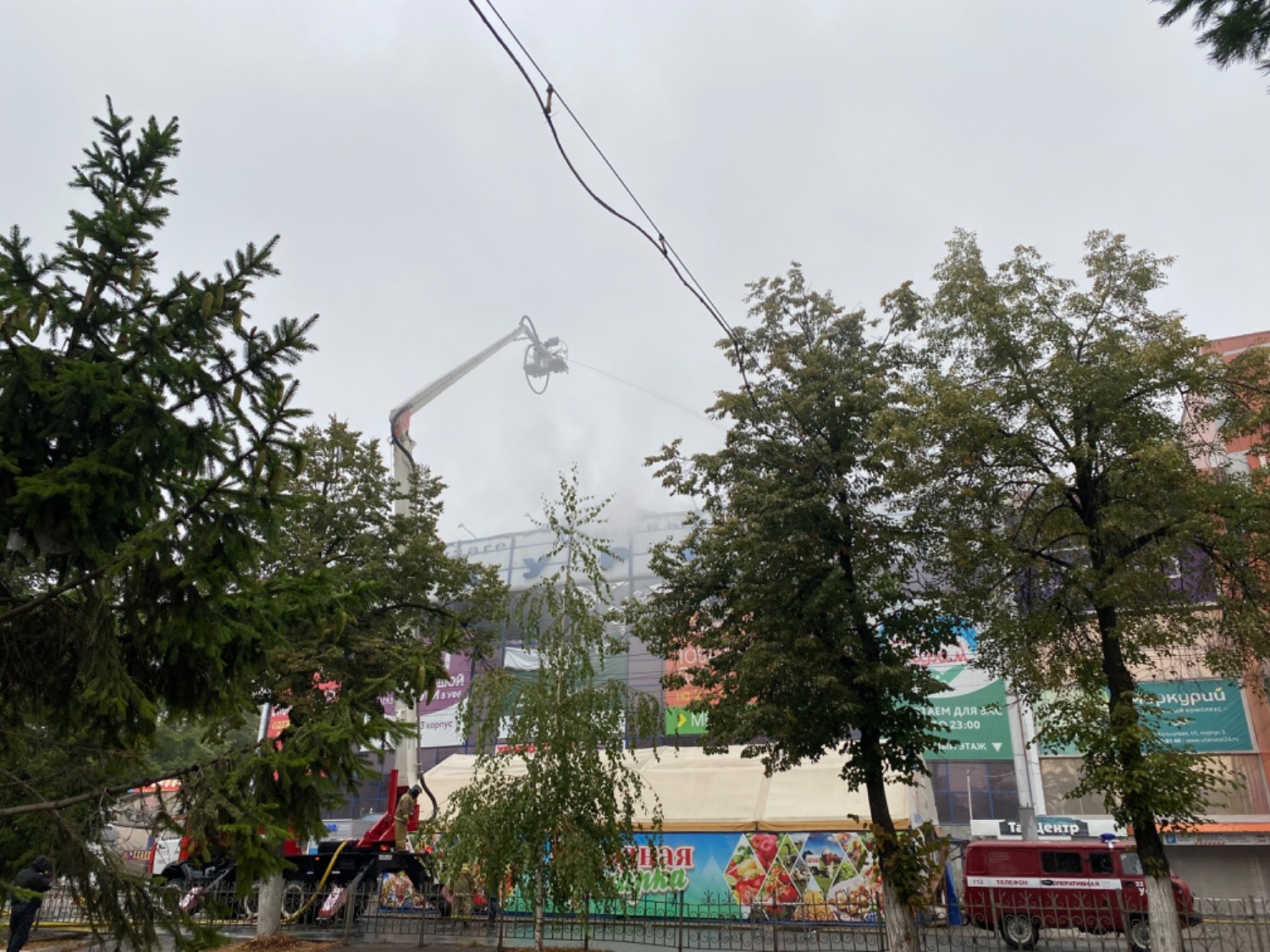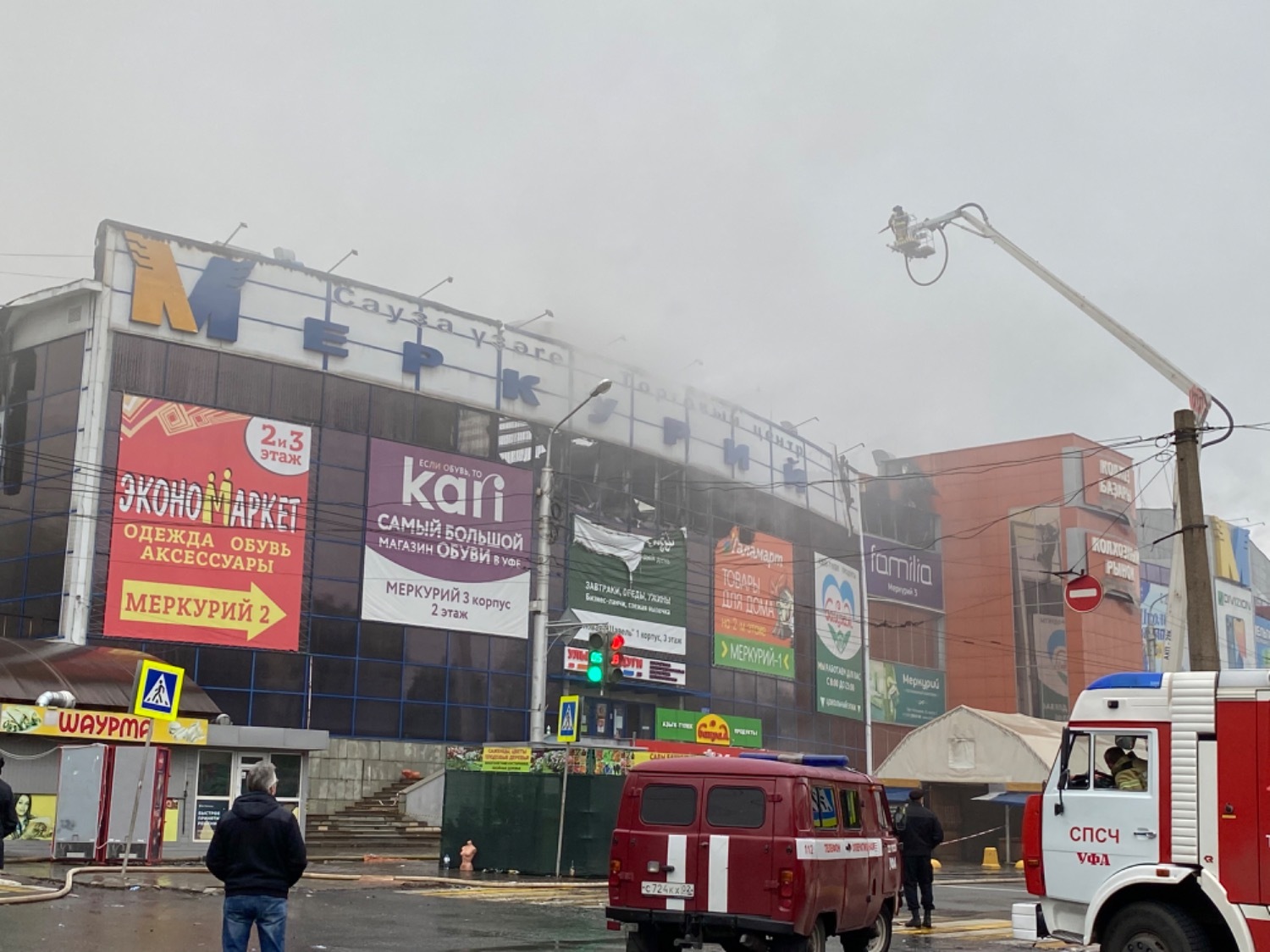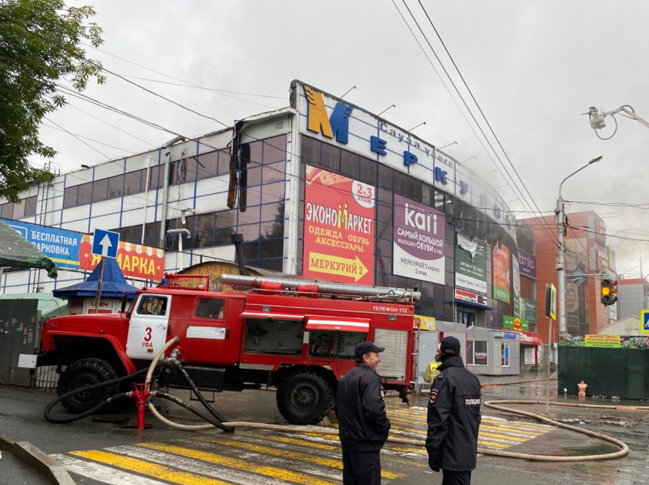 В Уфе уже около 15 часов продолжается тушение крупного пожара в торговом центре «Меркурий» по улице Кольцевой. По состоянию на 12:30 утра 10 сентября наблюдается тление в одном из корпусов ТЦ.