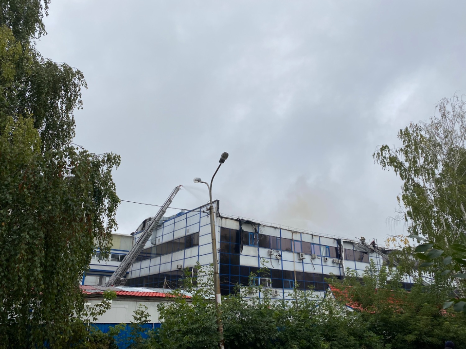 В настоящий момент пожарные заливают тлеющую крышу. Корпус, где расположен кинотеатр, фитнес-клуб, KFC и другие торговые объекты, визуально не пострадал. Также не наблюдалось горения в гостинице, которая находится рядом.
