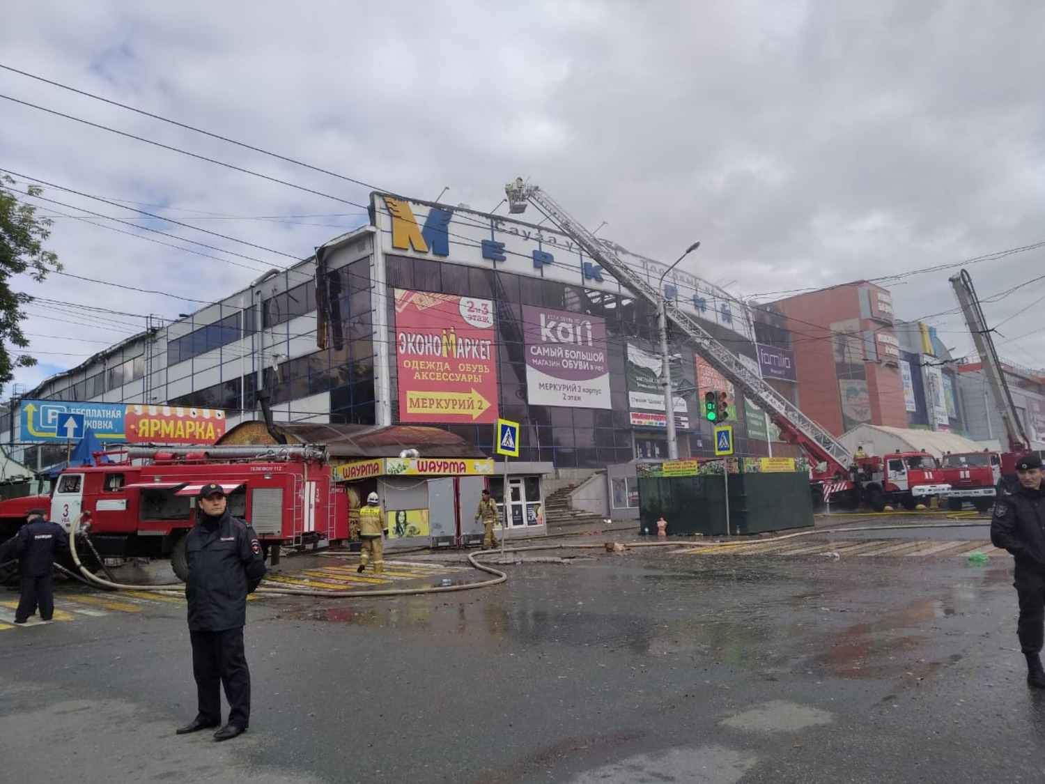 Территория вокруг торгового центра сильно задымлена. Подъездные пути перекрыты, выставлены патрули ГИБДД, гражданские машины не пропускают. Рядом с ТЦ дежурят сотрудники полиции, территория оцеплена. Вокруг, как и накануне ночью, снова собралось очень много прохожих, среди них хозяева и работники торговых точек.