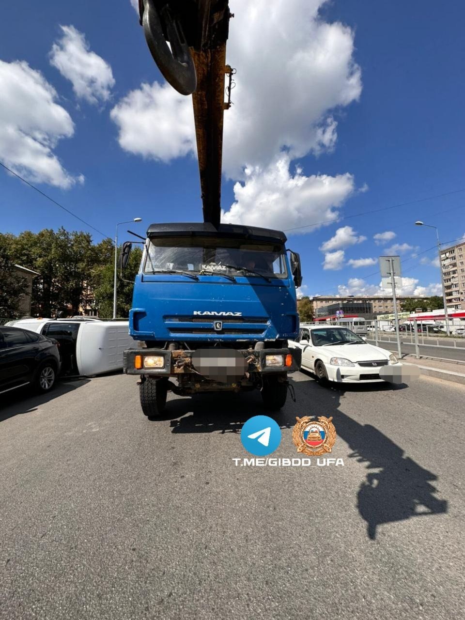 Как сообщили в отделе ГИБДД Уфы, ДТП произошло около часа дня 3 августа. «КамАЗ» ехал по улице Галле и при развороте столкнулся с припаркованным микроавтобусом Mercedes-Benz. От удара автобус перевернулся и врезался в BMW Х6.