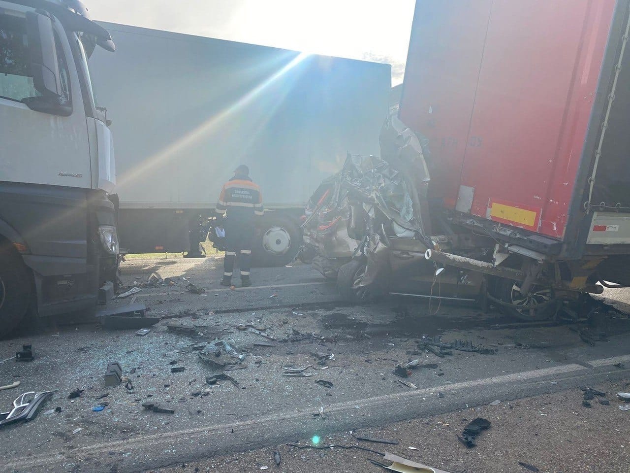 На 1231-м километре трассы образовалась пробка, в которой стоял кроссовер Geely ATLAS. И на этот стоящий кроссовер наехал грузовой а/м Mercedes-Benz Actros. По предварительной информации, у него отказали тормоза.