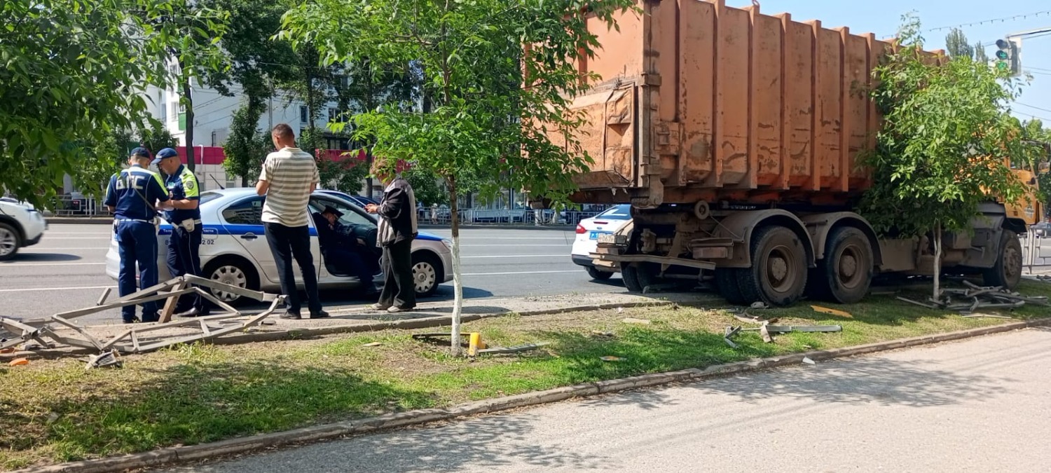 Сегодня в Уфе, на проспекте Октября, в районе Городского дворца культуры мусоровоз протаранил металлическое ограждение.