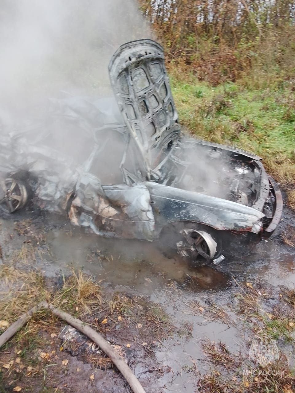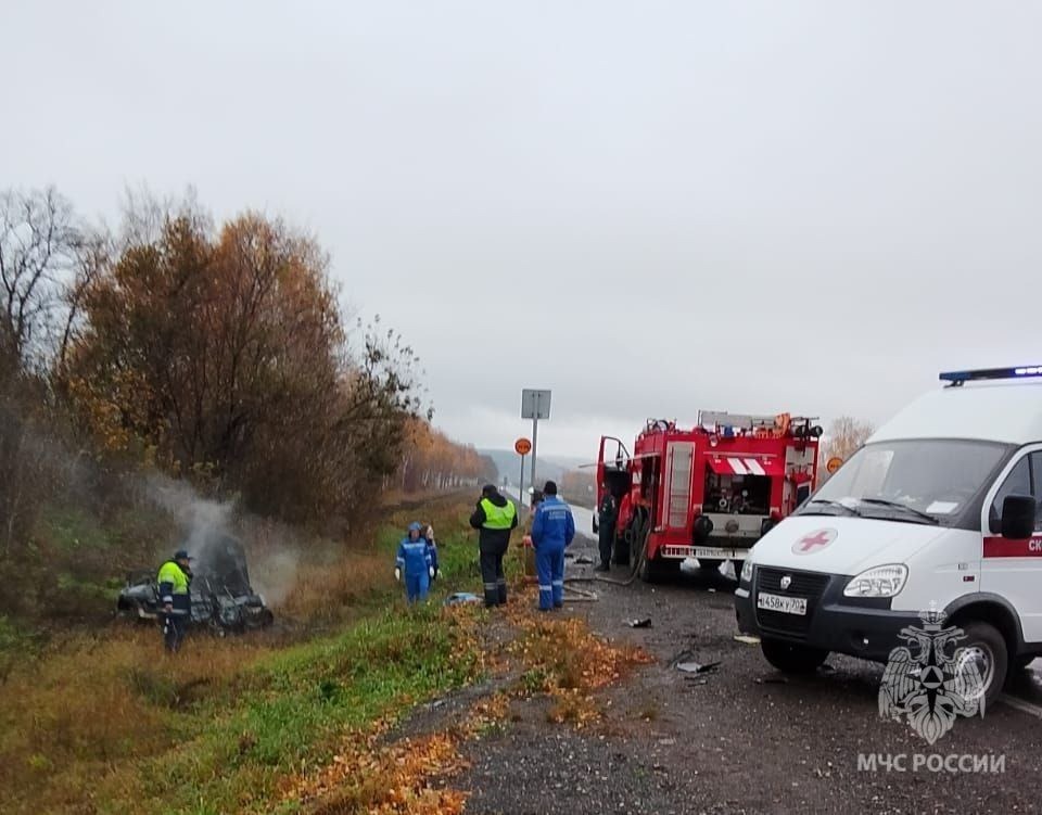 Пожарные МЧС ликвидировали возгорание автомобиля. В результате аварии погибли три человека, среди них один ребенок.