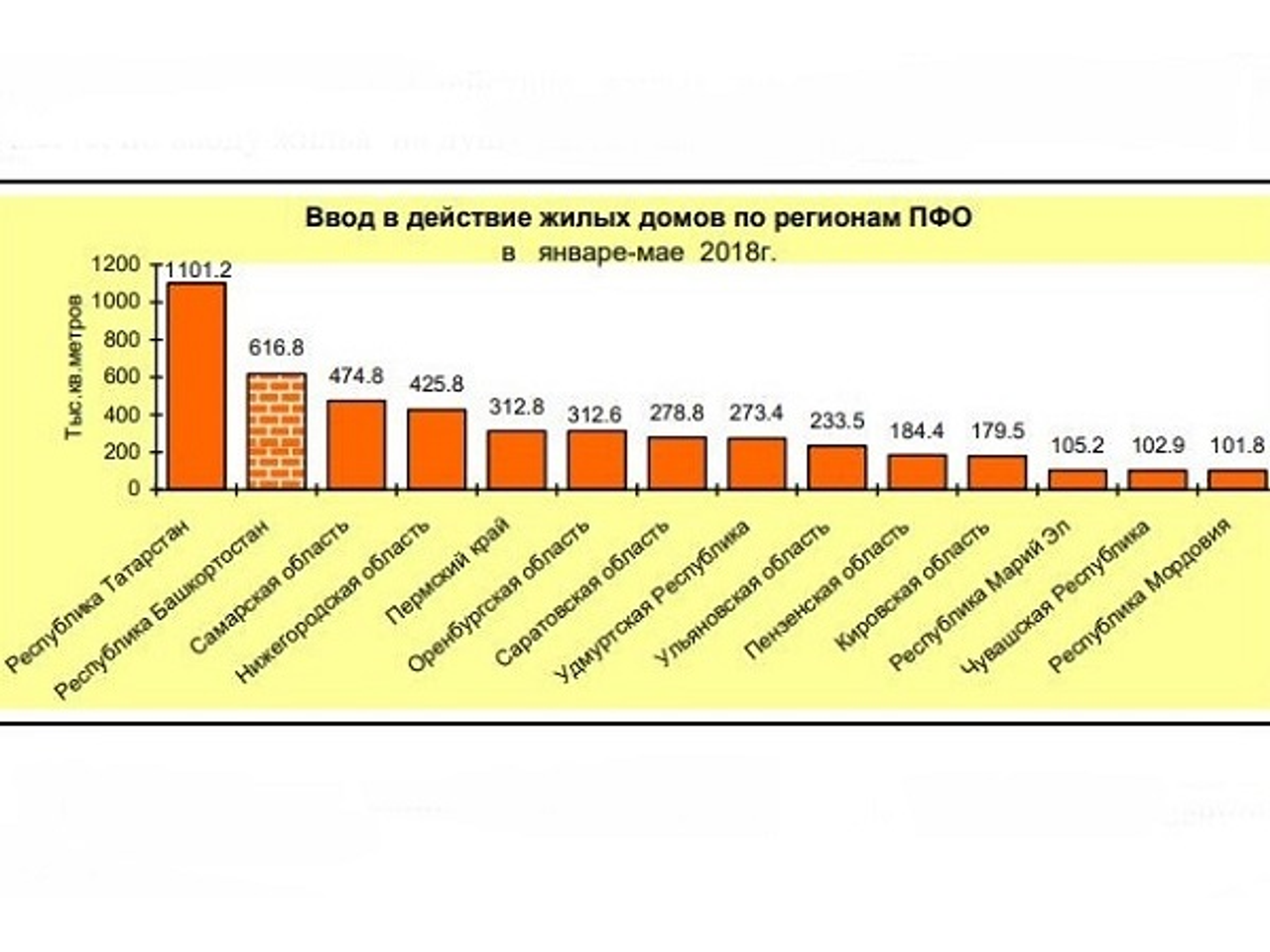 Башкирия среди регионов Приволжского федерального округа по итогам пяти месяцев 2018 года по вводу в действие жилых домов оказалась на втором месте после Татарии, по вводу жилья на душу населения — на шестом.