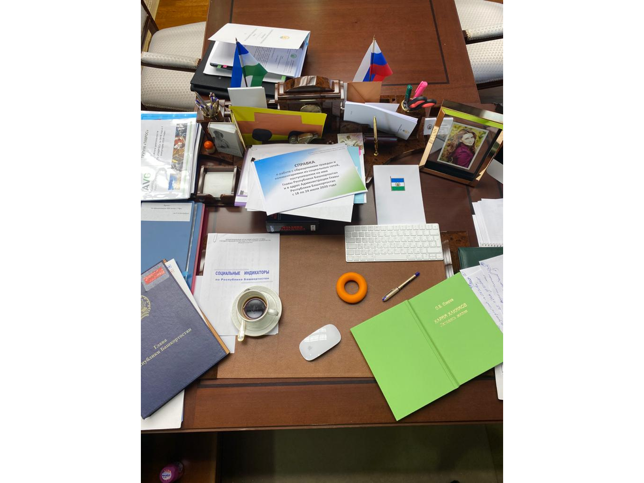 Глава Башкирии Радий Хабиров опубликовал в социальных сетях любопытное фото. Он показал своим подписчикам, как выглядит его рабочее место к концу дня. На столе творческий беспорядок — много документов, книга, тренажер для рук.