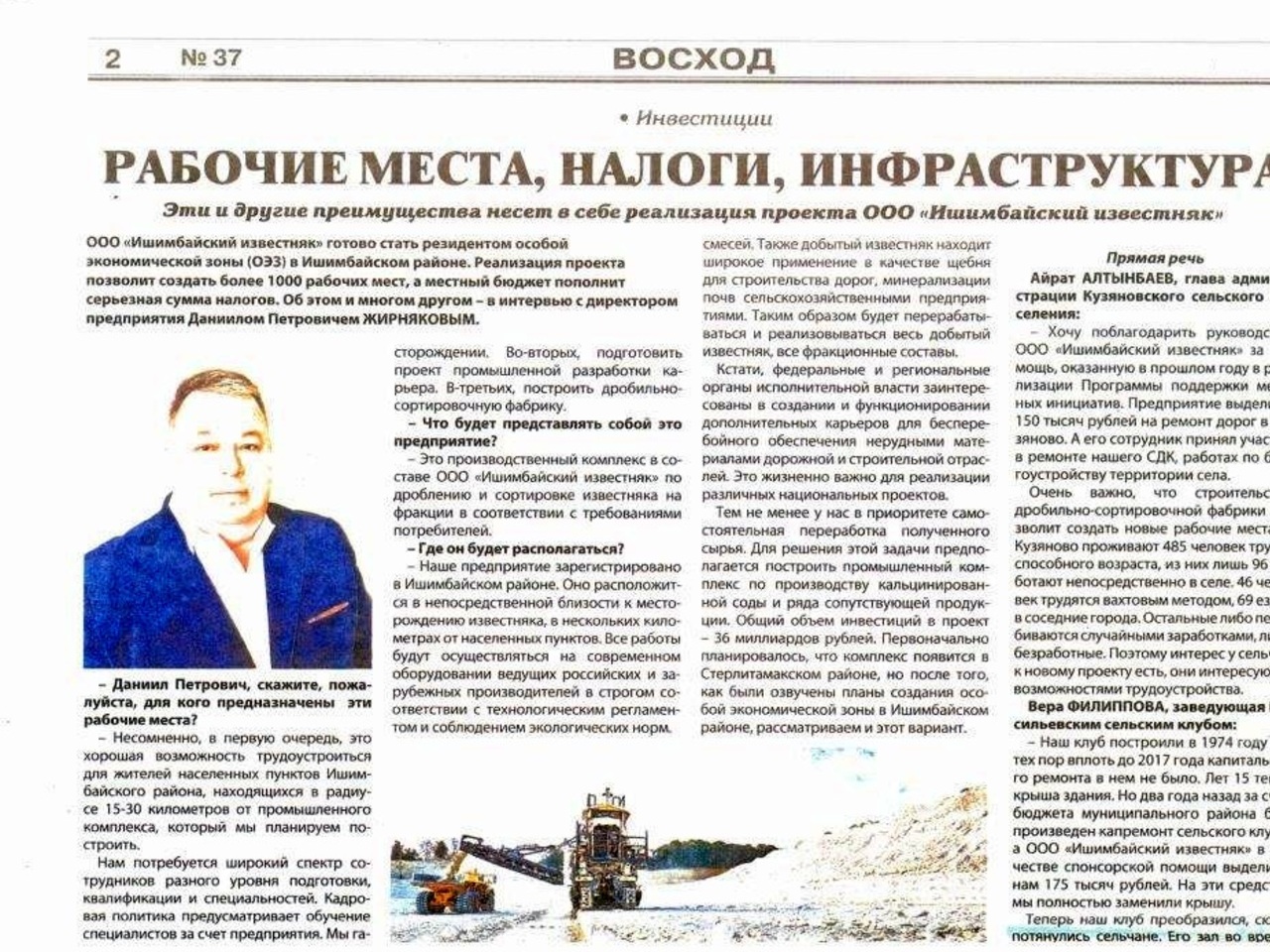 В газете Ишимбайского района опубликован материал о строительстве на Гумеровском месторождении известняка крупного промышленного предприятия.