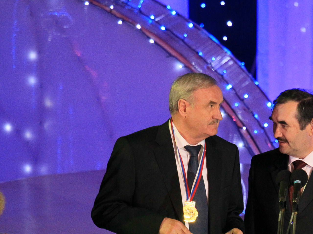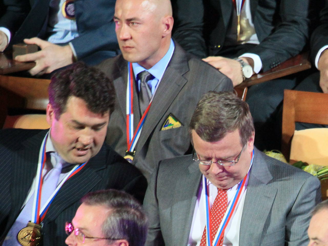 Команду, тренеров и ближний персонал ведущие объявляли аж три раза. Вначале вызывали по одному на сцену. Потом каждого - медаль получать. Потом, опять же каждого – за перстнями. Когда стали вручать памятные медали имени Юрия Гагарина, ведущий, понимая, что процедура уже и так слишком затянулась – пригласил сразу всю команду за наградой, чем очень сильно ускорил долгий процесс.