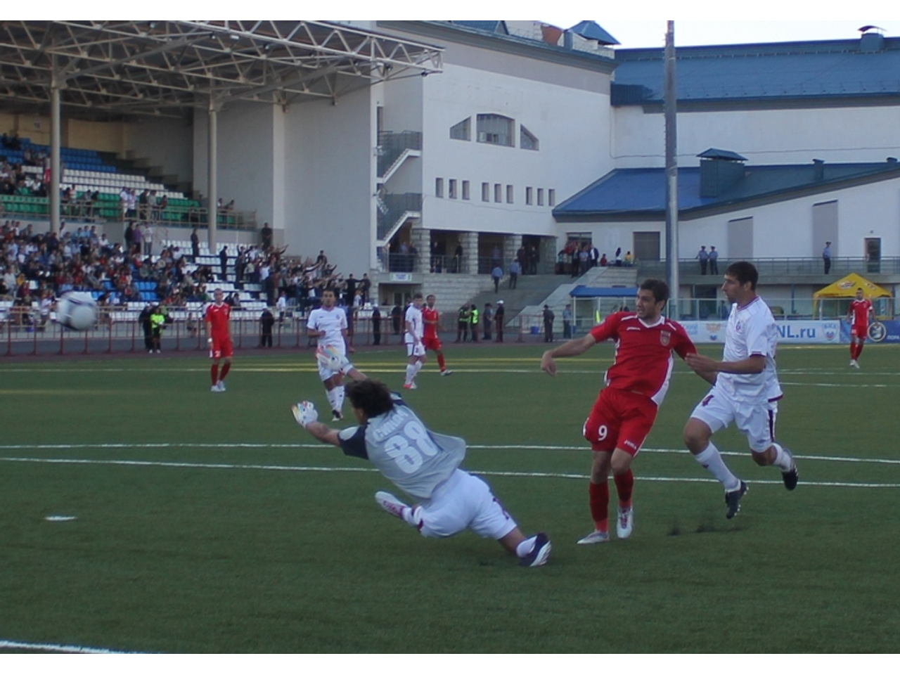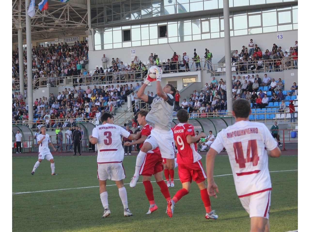 В перерыве во время разминки запасных радостный вратарь Дмитрий Изотов попросил меня сфотографировать его, как он сказал, «для газеты». Фотография не получилась. Вот не везет Изотову – и все. То Кобозев молодой «сухари сушит» один за другим, и приходится Изотову сидеть в запасе, то фотографии не получаются. Сфотографирую потом его еще раз.