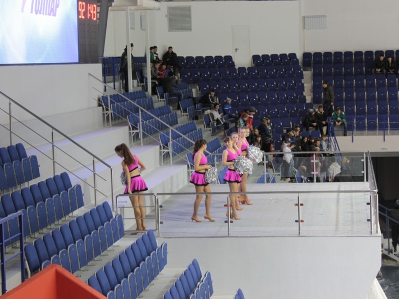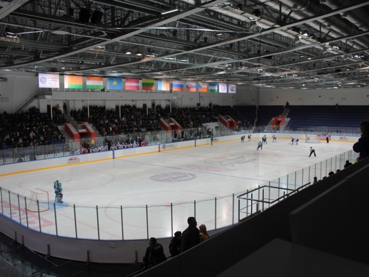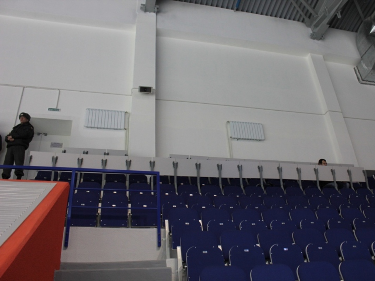 Действительно, почти в самом углу арены – места для прессы, отличающиеся от обычных зрительских серенькими хлипкими выдвижными столиками. Место настолько угловое, что в этом секторе зрители не сидят. И правильно делают – отсюда видно очень плохо. С самых угловых мест для прессы сложно разглядеть, что именно показывает цветное табло, а большую часть площадки созерцаешь сквозь черную сетку. Если что-то происходит у дальних ворот – то увидеть какие-то детали можно только при помощи хорошей оптики вроде бинокля. Когда «Толпар» пропускал очередную шайбу, я так и не понял, как она залетела.