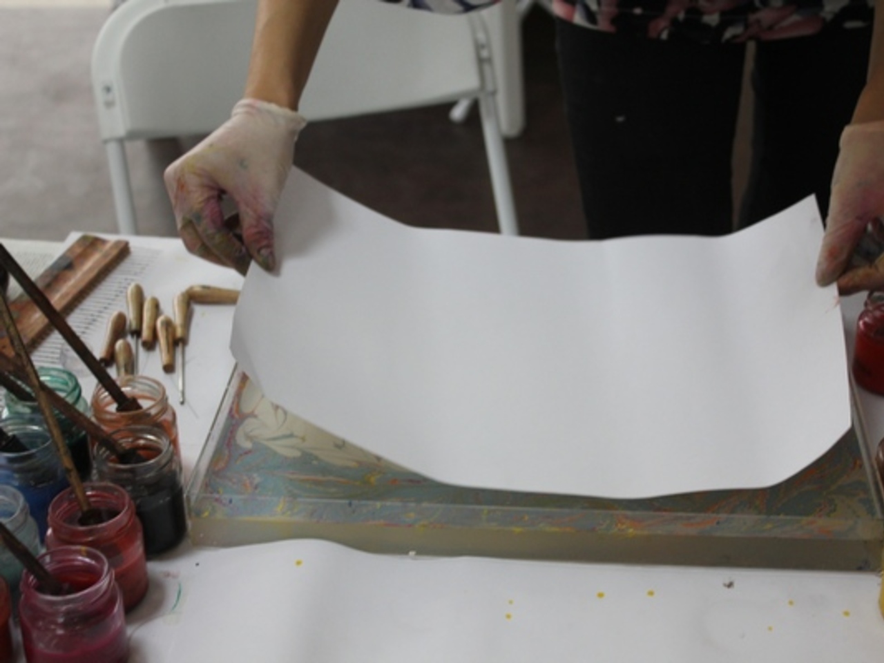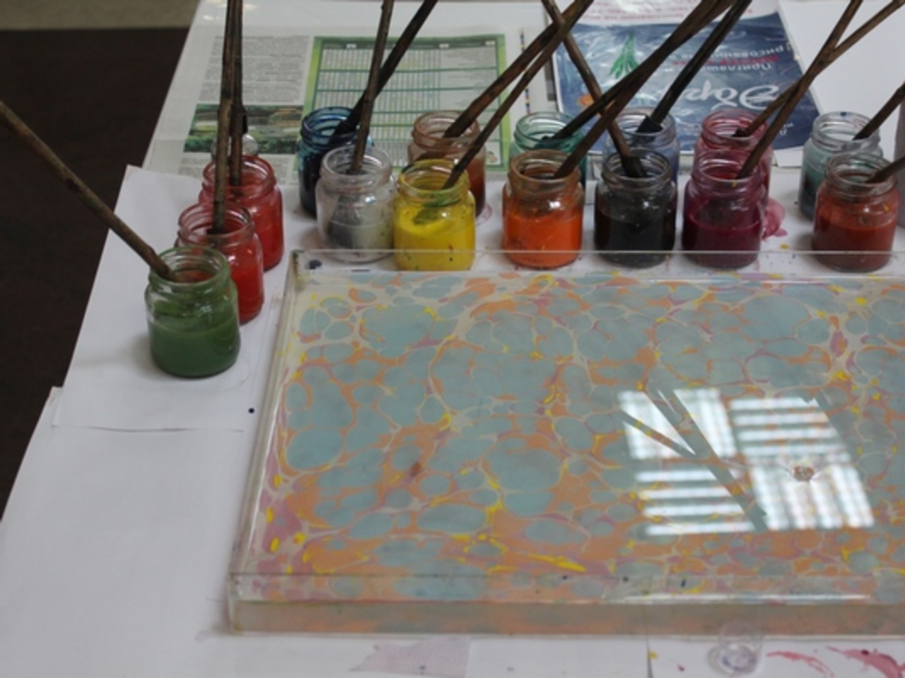 Лоток для воды подбирается в зависимости от размера листа бумаги. У Светланы лоток из оргстекла, в Турции используют металлические ёмкости.