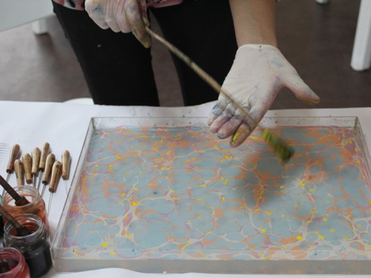 Краска наносится на поверхность воды каплями потряхивающими движениями рук. Один слой краски сменяется другим. Здесь важно не столько умело подобрать цветовую палитру, сколько почувствовать ритм собственных движений. Картина отразит настроение творца.