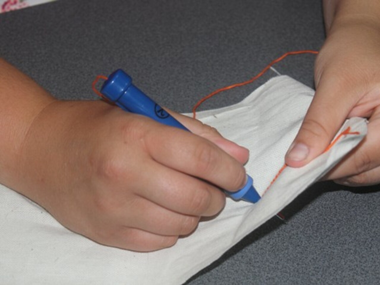 Сначала на ткань наносится эскиз карандашом. На рисунке не должно быть острых углов, отдельно взятых линий и близко стоящих друг к другу элементов. Нитковдеватель вставляется внутрь иголки. Нитка продевается насквозь через всю иголку и выходит через отверстие. При этом не должно быть никакого натяжения и никаких узелков, иначе рисунок не получится.