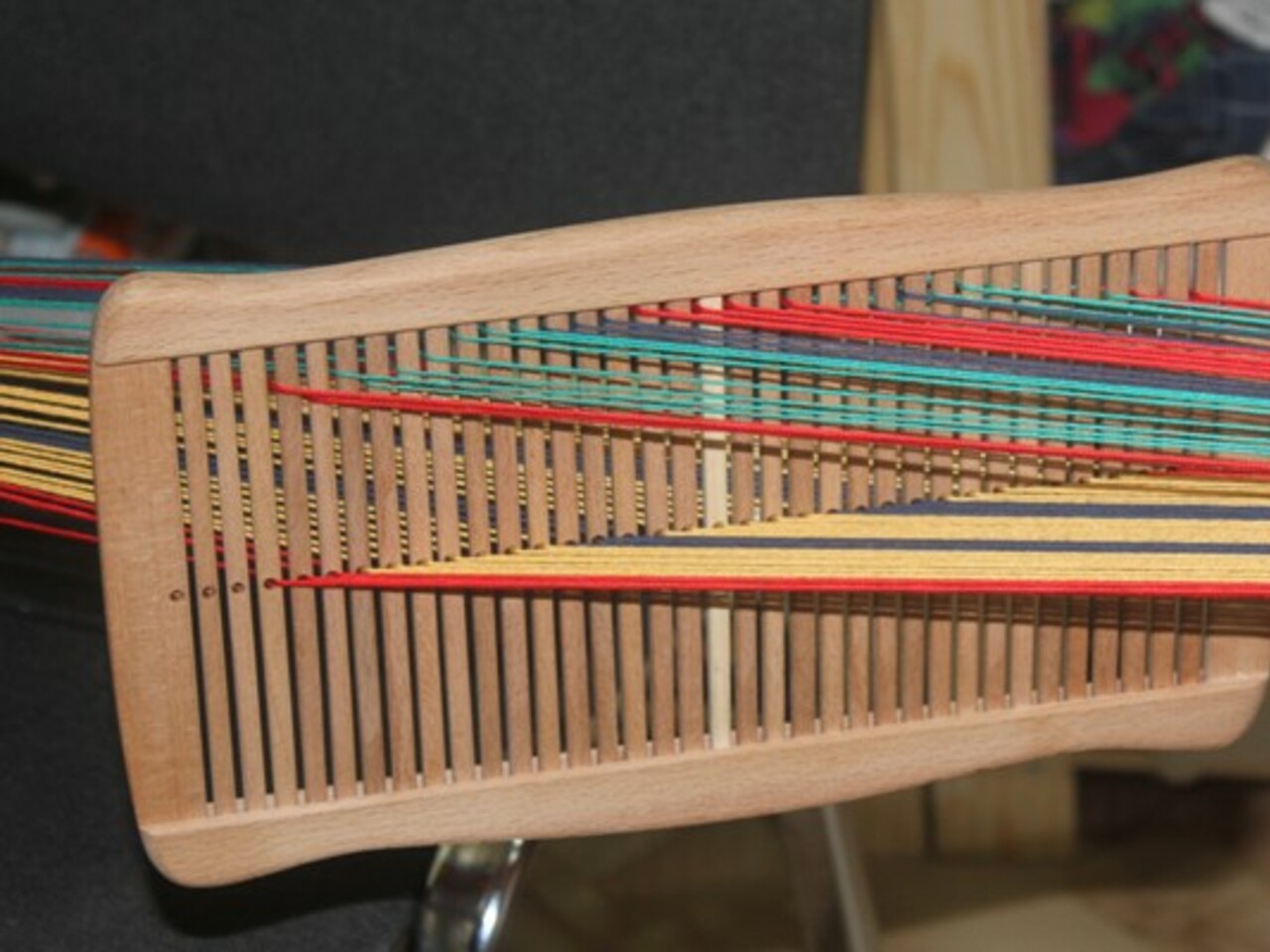 — Талией натягиваем нитки основы, — уточняет наша собеседница. — Образуется расстояние между верхними и нижними нитками («зев»). Пропустите поперечную нить (такая нить еще называется «уток») в зев между плоскостями ниток. Поднимите бёрдо вверх — нижние и верхние нити поменяются местами. Далее «подбейте» плетение ладонью (или ножом для ткачества) к краю готовой ткани.