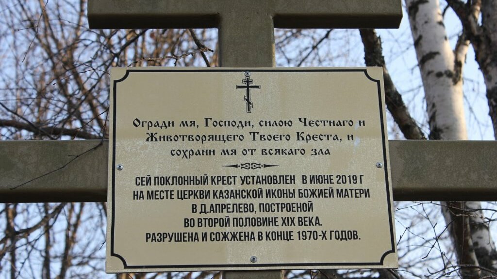 Вспоминает Владимир Фёдорович Петухов: «В Апрелове как поставили деревянную церковь, так она и стояла. Она небольшая была. Стояла примерно в 10 метрах от дороги, близко. Вид у неё церковный был, купол был наверху, ну креста уж не было. Когда совхоз был, там зерно держали. Потом кому-то понадобилось, кто-то её сжёг, костёр развёл…»